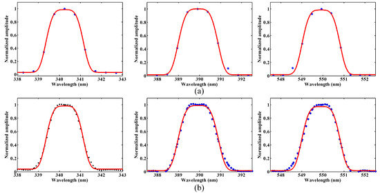 Different from conventional slits, the AAS employs a slit homogenizer [13,14,15,16], which has an SRF that does not represent a conventional Gaussian curve [12,13], as shown in Figure 2. The SRF of the slit homogenizer is a flat-topped multi-Gaussian function. Considering the convenience of fitting, a super-Gaussian function, which has a distribution similar to the flat-topped multi-Gaussian function, was utilized to fit the measured data in a spectral calibration.
