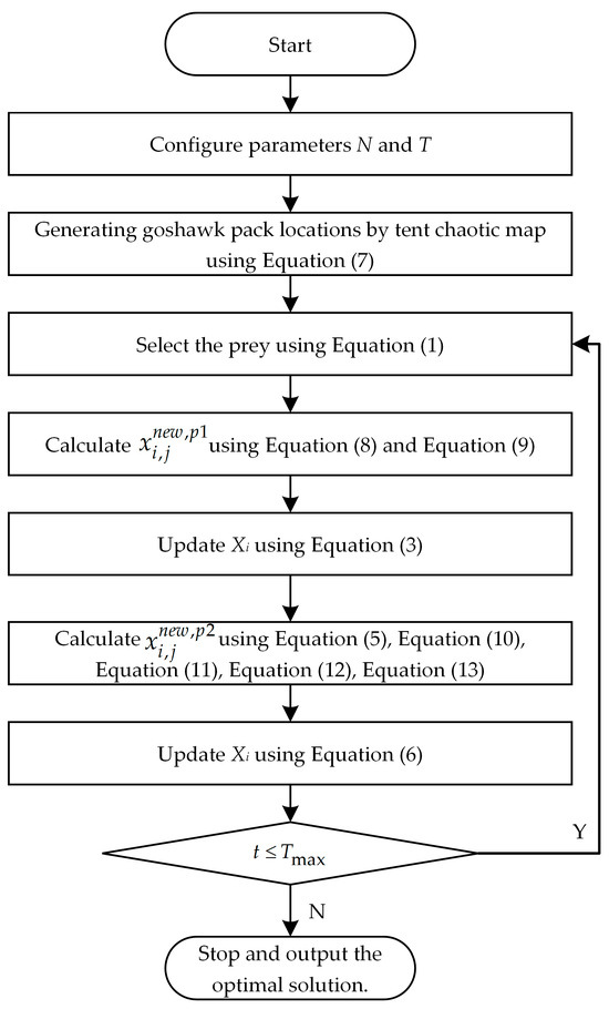 In this equation, Pi represents the prey’s position selected by the ith northern goshawk; represents the objective function value (i.e., the fitness value) of the prey’s location corresponding to the ith northern goshawk; k is a randomly chosen integer from [1, N]; represents the new position of the ith northern goshawk; represents the new position of the ith northern goshawk in the jth dimension; represents the fitness value based on the update of the ith northern goshawk following this step; r is a randomly generated value within [0, 1]; and I is a random integer of 1 or 2.