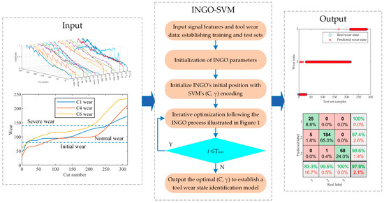 Building on the aforementioned research, we use an improved northern goshawk optimization algorithm to optimize the SVM’s penalty factor C and kernel parameter γ for tool wear state identification. First, the force, vibration and acoustic emission signals are gathered during the milling process. Next, to fully depict the correlation between the signals and tool wear, 245 features from the time, frequency and time–frequency domains are extracted from seven signal channels, forming the initial feature set. Third, to minimize the model’s runtime and data storage requirements while avoiding overfitting, the SVM-RFE model is utilized for feature selection, selecting the optimal feature set most closely related to tool wear. Fourth, the NGO is improved and applied for the first time to the parameter finding of SVM. Ultimately, the optimal feature set is input into the INGO-SVM model for training and prediction, achieving precise tool wear state identification. The feasibility and effectiveness of the proposed approach were validated using the Prognostic and Health Management Society Conference Data Challenge (PHM 2010) real-world dataset [29]. Experimental results show that the method effectively screens features related to tool wear and exhibits strong learning ability to accurately identify tool wear state, achieving an identification accuracy of 97.9% with small sample data. This offers a novel approach for research on tool wear state identification.