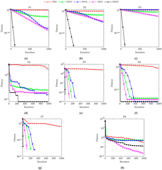 Convergence curves of each algorithm: (a) F1; (b) F2; (c) F3; (d) F4; (e) F5; (f) F6; (g) F7; (h) F8.