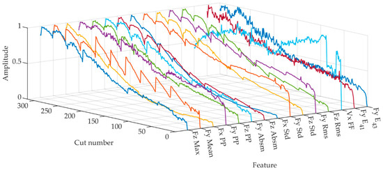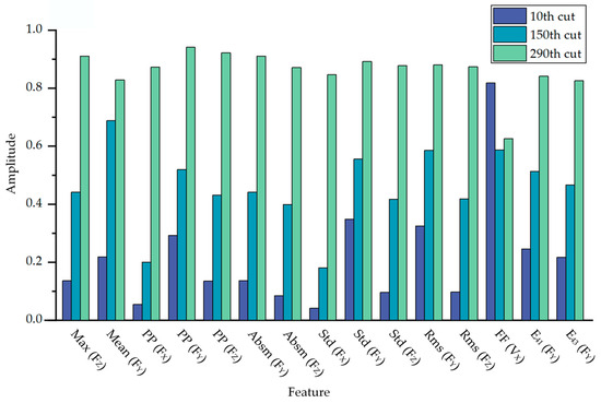 Taking into account the real-time monitoring requirements, we retained 15 features to form the optimal feature set. Table 7 presents the final set of optimal features, where E41 and E43 represent the WPE of the second and fourth frequency bands. Exemplified using milling cutter C1, we selected the amplitudes of these features during the 10th (initial wear), 150th (normal wear) and 290th (severe wear) milling pass for comparison, as depicted in Figure 6. Concurrently, Figure 7 displays the variation trends of these 15 features after normalization.