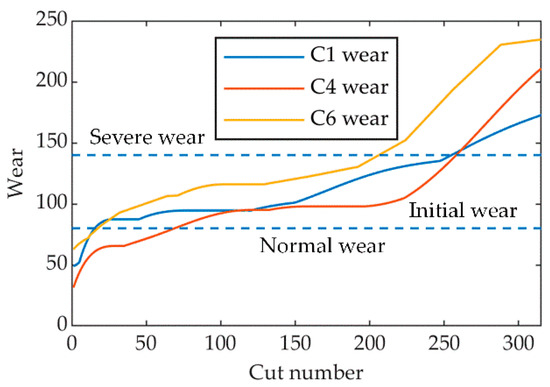 Based on the existing literature, tool wear can be categorized into three states: initial wear state (0–80 μm), normal wear state (80 μm–140 μm) and severe wear state (140 μm–∞) [3,42,43]. Figure 8 displays the wear curves of the three milling tools, leading to the sample size distribution for each category, as depicted in Table 8. An optimal set of features of the three milling cutters and their corresponding label categories were formed into a dataset. Samples from each category were divided into training and testing sets at a ratio of 0.7:0.3. The dataset was then input into the INGO-SVM identification model to evaluate the identification performance of our proposed approach.