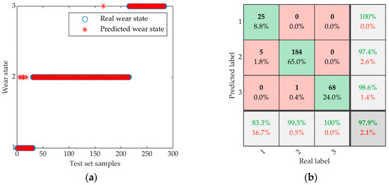 Identification results of INGO-SVM: (a) Identification results of wear state; (b) Confusion matrix.