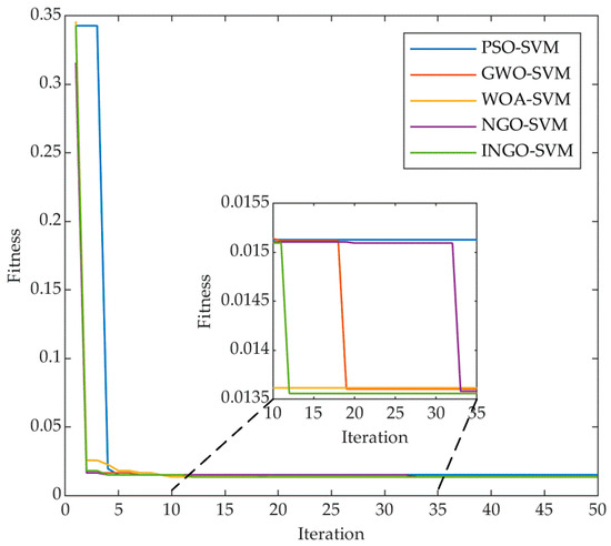In this paper, we compare INGO-SVM with PSO-SVM [24], GWO-SVM [25], WOA-SVM [26], NGO-SVM and unoptimized SVM using the same data. For each algorithm, the population size was established at 10, and the maximum iteration count was designated as 50. The initial parameter settings for each algorithm are as shown in Table 2. Figure 10 displays the fitness variation curves of the five identification approaches on the training set, while Table 10 presents the wear state identification results on the test set. As shown in Figure 10, all five algorithms converge to a stable state as the number of iterations increases. PSO converges quickly and requires fewer iterations to reach the optimal value, while GWO eventually converges to a better accuracy than PSO but requires more iterations. WOA exhibits similar convergence characteristics to PSO but ultimately converges with the same accuracy as GWO. During the early iterations, the fitness value of NGO changes relatively little and only converges to the same value as GWO at the 33rd iteration. All four algorithms except INGO fall into local optimality, leading to poorer identification results in the test set. In contrast, INGO converges by the 12th iteration and achieves the optimal value among all algorithms, with the optimal value for C being 45.981 and the optimal value for γ being 0.3861, indicating that INGO possesses faster convergence and higher accuracy in this particular scenario.