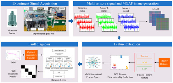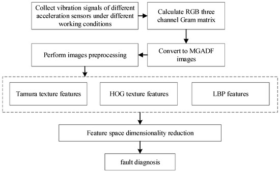 The fusion of Tamura-HOG-LBP features improves the multi-texture feature fusion extraction process of GAF images, which is shown in Figure 2. Firstly, a PMSM fault simulation experimental platform is constructed and pre-configured with different fault types on the PMSM. Normal motors and three common typical faulty motors, including ITSF, LDF and EF motors, are designed and fabricated to carry out experiments under different operating conditions. The acceleration signals of the operation process are collected. The improved GAF image transformation is performed on the acquired signal fragments, which can comprehensively reflect the detailed features of the motors. Then, the acquired images are uniformly sized and pre-processed with a grayscale, and then the Tamura-HOG-LBP features of the images are extracted, respectively, to obtain the vector space of all the features. The dimensionality reduction is required to improve the recognition speed. Finally, pattern recognition is combined with the classifier to complete the fault diagnosis.