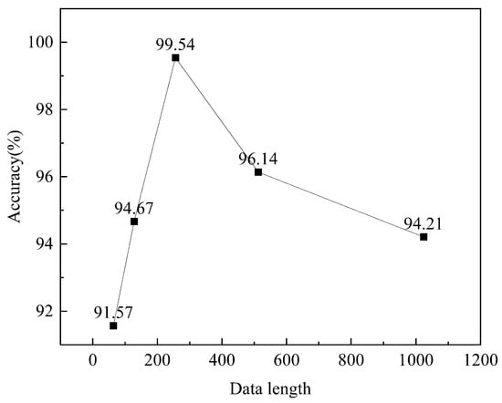 The length of the dataset to be coded is usually 2n, e.g., 64, 128, 256, and 512. As shown in Figure 7, the average accuracy of coding with MGADF for different data lengths is highest when the data length reaches 256. Accuracy declines after 256 bits of data are used. The data length in the following text is 256 because each pixel in the feature map created by the encoding at this point has been compressed and does not accurately represent the features of the original data.
