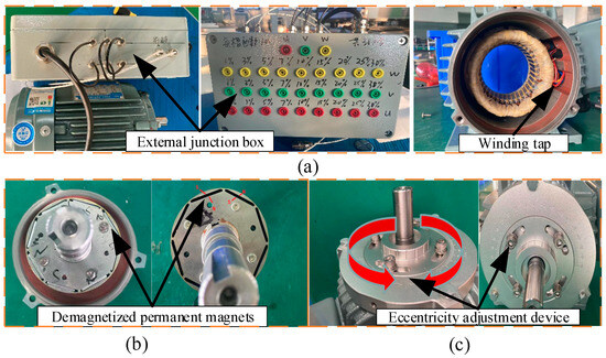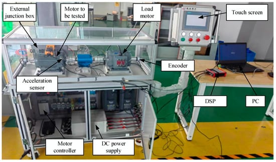 To verify the reasonableness of the proposed method in practical applications, a PMSM fault simulation platform is constructed, as shown in Figure 8. In the experiment, the proposed algorithm is tested on a PMSM with pre-configured faults. The main components of the experimental platform include: the PMSM to be tested, load motor, encoder, touch screen, Digital Signal Processor (DSP), personal computer (PC), direct-current power supply (DC power supply), and so on. The parameters of the PMSM to be tested are shown in Table 1, and the radial vibration data were measured, including four states (healthy state and three types of vibration signals with similar time-domain characteristics of faults): (1) Healthy Condition (HC); (2) Inter-turn Short circuit Fault (ITSF); (3) Local Demagnetization Fault (LDF); (4) Eccentricity Fault (EF). The details of the fault preset are shown in Figure 9. For the ITSF, an internal short circuit fault is simulated where the PMSM is rewound and connectors are led on 1–30% of the total number of coils in the u, v and w phase windings to an external junction box. By connecting the terminals of the junction box, ITSC faults with different numbers of turns short-circuited can be simulated on the PMSM. The experiment simulates the 20% short-circuited state of the u-phase winding; for the LDF, when a single permanent magnet is being magnetized, one of them is controlled to be magnetized up to 70% of the nominal magnetic density, and 30% of the local demagnetization is simulated; for the EF, the rotary eccentric device is designed by rotating the eccentric device of the two ends of the PMSM to achieve the adjustment of static eccentricity. The corresponding relationship between the rotation angle and the static eccentricity is , where is the static eccentricity, and is the angle of the eccentric device, which is set to 20° during the experiment. The sampling frequency of these data is 10 kHz. Each sample contains 2k points. The acceleration sensor parameters are shown in Table 2.
