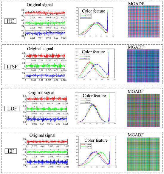 The vibration signals, color features and MGADF images are shown in Figure 10. The vibration sensors collect red, green and blue signals from the axial, radial and seat. The time series are periodic and vary under different motor states. These signals correspond to different Gramian matrices corresponding to different RBG channels to form the MGADF. Therefore, the MGADF images are different for different fault states, showing different color characteristics. This difference is also evident when examining the RGB histogram.