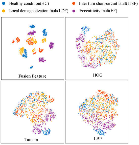 Based on the dataset, feature vectors are extracted by the fusion of Tamura-HOG-LBP texture features. High-dimensional data visualization is made possible by t-SNE. When we apply t-SNE to n-dimensional data, it will intelligently map n-dimensional data to 3D or even 2D data, effectively preserving the relative similarity of the original data. Because t-SNE follows nonlinearity rather than linearity, it is able to capture the intricate flow structure of high-dimensional data. In Figure 13, it can be observed that the features extracted by HOG become distinguishable to some extent and the features extracted by Tamura and LBP are less distinguishable. Of all the methods, feature fusion combines the strengths of all three texture feature extraction methods and proves to be the most effective in distinguishing the features associated with PMSM faults.