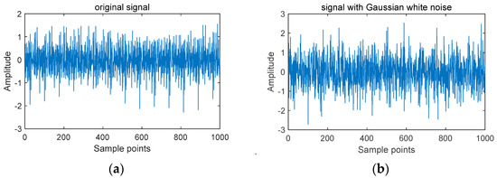 Comparison of original signal and after the adding of Gaussian white noise. (a) Original signal. (b) Signal with Gaussian white noise.