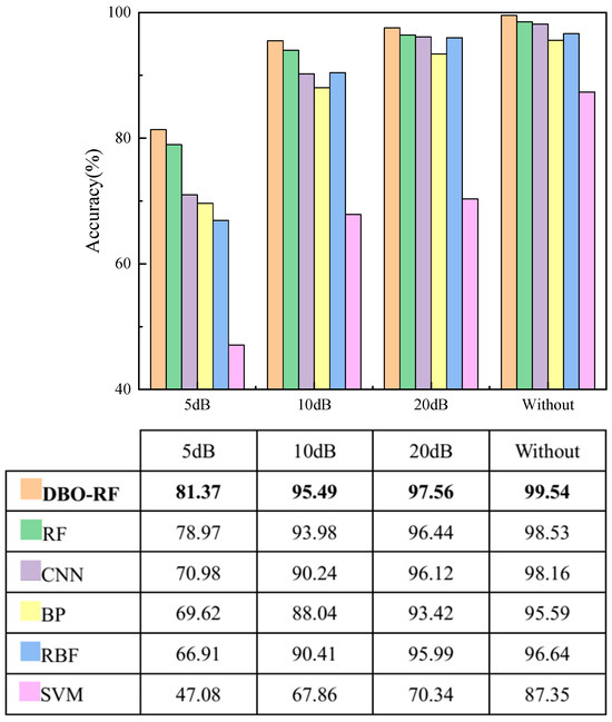 Gaussian white noise at signal-to-noise ratios of 5 dB, 10 dB, and 20 dB was introduced to the original test dataset to evaluate the overall test accuracy. All methods were assessed at these three noise levels. As illustrated in Figure 16, the performance of all algorithms deteriorates as the noise level increases. Notably, across different noise levels, the proposed algorithm outperforms all other techniques. These results demonstrate that the algorithms presented in this paper exhibit high noise immunity and achieve a consistently high overall test accuracy.
