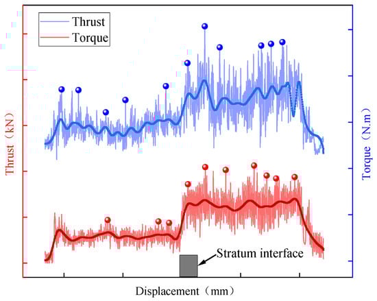 However, during the actual drilling process, various disturbances, such as non-homogeneous bodies and equipment limitations, exist, leading to fluctuations in the collected data [15], as illustrated in Figure 1. The local peak points on the curve are labeled, and it can be observed that peak points with high rates of change can interfere with the accurate detection and positioning of interfaces. This interference is particularly significant for indicators with a high volatility, such as the torque, as the rate of change of certain peak points on the curve surpasses the corresponding characteristic value of the interface stage points, resulting in recognition errors.