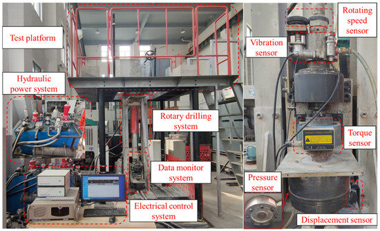 The drilling test system used for this drilling test is shown in Figure 4. The test system consists of a test platform, hydraulic power system, electrical control system, rotary drilling system, and data monitoring system. To be more specific, the hydraulic power system can provide a maximum torque of 400 N.m, a maximum thrust of 100 kN, and a propulsion stroke of 1000 mm. The electrical control system incorporates control devices and a computer, enabling a precise control over the rotational and penetration speeds. Moreover, the data monitoring system consists of a programmable logic controller (PLC) and high-precision sensors, allowing for real-time monitoring and data collection concerning various parameters such as the thrust, torque, displacement, rotational speed, and vibration, with a frequency of 3 Hz. In the conducted tests, standard B19 drill pipes and a Φ28 PDC drill bit were utilized for mining purposes.