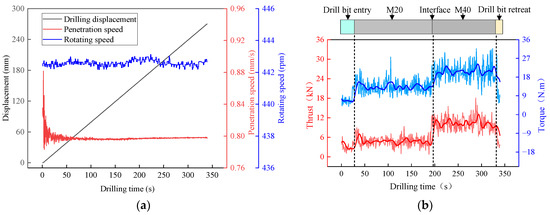 The samples were drilled based on the test protocol, and data on the thrust, torque, displacement, rotating speed, and displacement were collected for the whole drilling test. To analyze the data characteristics of the drilling parameters, a representative test group, denoted as 1-450-0.8, was selected for in-depth analysis.