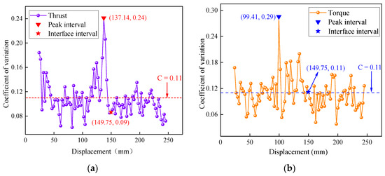 To evaluate the feasibility of interface detection using the thrust and torque, an analysis of the distribution characteristics of interval fluctuations for these indicators was conducted. Figure 7 present the distribution curves of the variation coefficients for the intervals of thrust and torque, focusing on the typical test group 1-450-1.0.
