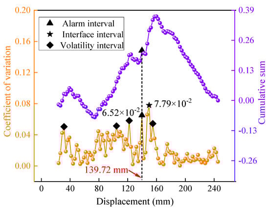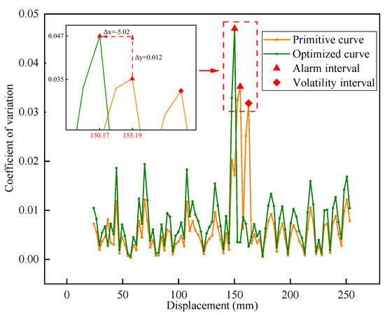 In Figure 16, the distribution curve of the interval variation coefficient of the SEL index before and after the optimization of the test group 3-450-1.0 is presented. Before optimization, the curve displayed two fluctuating peaks, which could potentially interfere with interface detection. Additionally, the alarm value and corresponding displacement were recorded as 0.035 and 155.19 mm, respectively. However, after optimization, the number of peak points in the coefficient of variation curve reduced from 2 to 1, and the peak value increased by 0.012. Comparatively, the peak became more prominent to the average distribution level, thereby reducing the difficulty of interface detection. Consequently, the detection error was significantly reduced from 4.69 mm to 0.33 mm, and the optimization rate reached an impressive 92.96%. These results demonstrated the substantial optimization and enhancement effects of the self-adaptive logistic function.