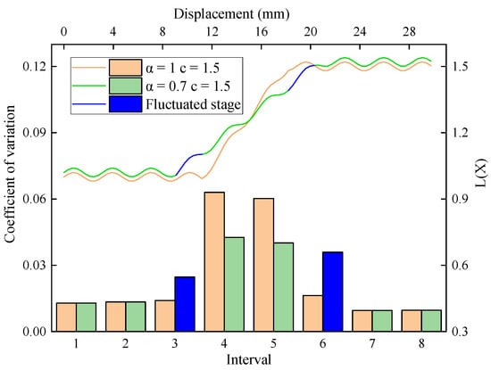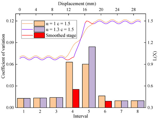 Figure 10 shows the distribution of the L(x) function and the interval coefficients of variation when and are taken as 1.3 and 1.0, corresponding to the actual and ideal values of the parameters, respectively. The transition phase from the low to high levels of the curve was shorter for 1.3 compared to 1.0. Additionally, the former exhibited a narrower distribution of intervals with high variation coefficients. When the actual value of the parameter exceeds the ideal value, it results in the smoothing of some data points within the interface stage and a reduction in the coefficients of variation for the corresponding intervals. Consequently, there is a risk of excluding the actual interface interval from identifiable intervals.