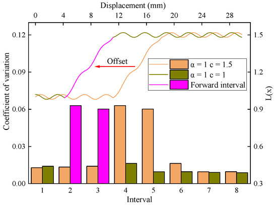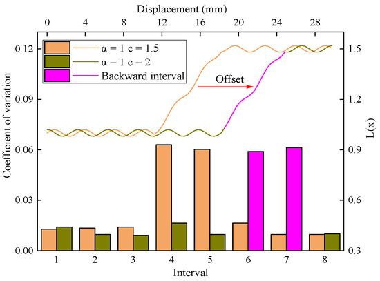 Figure 12 shows the distribution of the L(x) function and the interval variation coefficients when and are taken as 1.5 and 2, corresponding to the actual value and the ideal value of the driving parameters, respectively. The high fluctuation intervals corresponding to the curves at 1.5 and 2 were No. 4, No. 5 and No. 6, No. 7, respectively, which meant that, compared with the former, the conversion phase of the latter was shifted backward. Correspondingly, if the actual value of parameter is larger than the ideal value, the interface feature intervals will be backwardly misaligned, and their corresponding position will be shifted to the back of the actual interface position, which could interfere with the detection and positioning of interface features.