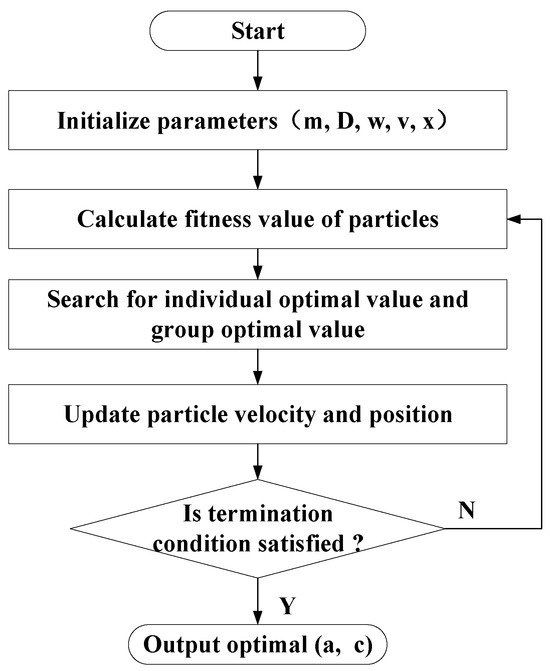 The PSO optimization model utilizes the fitness function to determine both the individual optimal parameter value and the group optimal parameter value in each generation. Through iterative updates based on optimization rules, the model aims to reach the historical optimal values of and , which lead to the best recognition effect for the SEL. The flow chart of the PSO algorithm is presented in Figure 13.