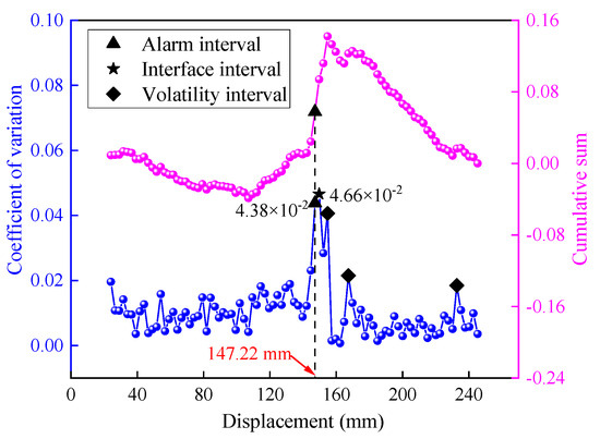 In a word, building upon the preceding analysis of drilling interface characteristics and detection feasibility, a method for detecting interfaces by monitoring the change point of the interval coefficient of variation using the cumulative sum (CUSUM) algorithm is proposed. In the drilling of non-interfacial rock formations, the lithology tends to remain relatively stable, resulting in minimal fluctuations in the corresponding interval coefficient of variation of the drilling index. However, when the drill bit encounters the interface between rock formations, the lithology on either side of the interface changes, leading to a noticeable fluctuation in the interval coefficient of variation.