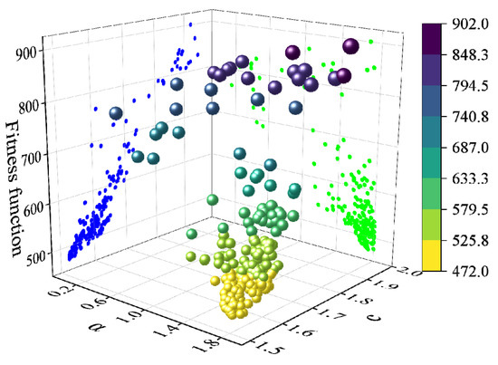 Upon observing Figure 15, it is evident that the particles were initially scattered across the space. Throughout the iterative process, the particles continuously improved their distribution positions based on individual optimal positions and the optimal position of the entire population. Gradually, the particles congregated toward regions with lower fitness values. When a particle reached a position with the lowest fitness, the spatial coordinates (1.61, 1.55) corresponded to the optimal values of the driving parameters and . Simultaneously, the optimization iteration for the entire population was also completed.