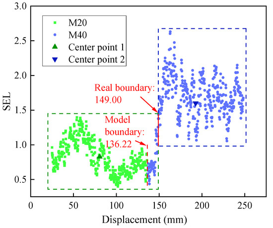 The K-means clustering model shown in Figure 19 applies the algorithmic principle to divide the SEM data into drilling data at intensities of 20 MPa and 40 MPa. The boundary for the data corresponding to two strengths indicates the interface of the rock layer, which is observed at a displacement of 136.22 mm. It deviates by 12.78 mm from the actual interface position of 149.00 mm. This discrepancy can be attributed to how the K-means clustering algorithm divides centroids and classifies data based on the minimum distance within classes and the maximum distance between classes.
