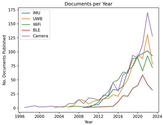 Documents per year for different indoor positioning technologies. Results obtained from Scopus.