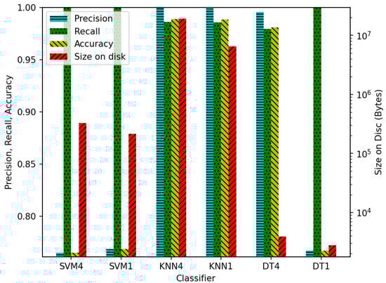 In order to provide a comparison of various ML models, three different classifiers were trained to perform the task of LoS determination on a synthetic BLE AoA dataset. The dataset was generated using ray tracing to trace the path taken by signals from a BLE transmitter to a 4 × 4 array of BLE receivers. As per the BLE 5.3 specification, the receiver generated an I/Q sample pair at each sampling slot, with eight pairs being collected from the reference antenna before sampling the rest of the array [126]. The classifiers were trained on one I/Q sample per antenna and four I/Q samples per antenna, respectively, to determine the effect on the size of the final model and the size of the data vector needed for inference. The chosen classifiers were SVM, KNN, and DT algorithms. The classifiers were evaluated on precision, recall, and accuracy as well as on the final size of the model. The results of this analysis can be seen in Figure 4. Using one sample per antenna instead of four results in a reduction in the size of the input data vector while having negligible effects on the performance of the final model, as demonstrated in Figure 4. Furthermore, there are significant benefits in terms of the size of the final models. KNN, while performing the best in terms of precision, recall, and accuracy on both of the tests, performs far worse in terms of disk size. This is because KNN works by comparing the input vector to every single instance in the dataset in order to determine which samples it is closest to. This has significant implications for its potential use in TinyML operating on severely memory-limited devices.