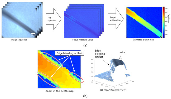 When SFF is performed in a microscopic environment, depth blurring occurs more often at the edges than in a general environment. This artifact is called an edge bleeding artifact, in which the depth estimated from the object edge spreads into continuous values. Figure 1b shows that depth is blurred at the edge between the wire and the background. In microscopic images, the depth of field (DoF) is very short, so defocus blurring affects a wide area [22,23]. When an object is blurred, the gradient component in the area around the edge increases, which is measured by the FM operator. Nevertheless, the FM value around the edge becomes larger than the FM value of the object if the texture is weak, which causes edge bleeding artifacts, regardless of whether the texture of the object is strong. This artifact has the characteristic that postprocessing algorithms do not easily remove it because it forms a continuous value with the depth of the surrounding area.