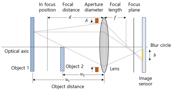 where is the focal length; is the focal distance, which is the distance to the focus position; and is the circle of confusion. is the f-number, , and a parameter that is proportional to the DoF. is the aperture diameter. Equation development was simplified by approximating the DoF using the thin-lens formula [30]. The effect of the defocus blur occurring at the object edge, except for the effect by the object texture, was checked by placing objects 1 and 2 at object distance and , respectively, as shown in Figure 2. Assume that the image of object 1 in focus is a single-tone image and the image of object 2 in focus is a single-tone image . Here, is the unit step function, and domain and are coordinates in the image sensor plane. Because object 1 is masked by object 2, the defocus image at focal distance taken by applying the transmittance map, , of the object 2 layer, as shown in Equation (2).
