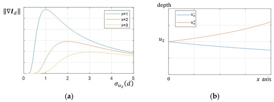 The gradient increases close to the edge and when the difference in brightness between two objects is large. The depth estimation method in SFF finds the focus distance when the FM value is a maximum. Therefore, the gradient according to the focus distance is important. Figure 3a shows the graph to see the change according to blur parameter of the gradient . The gradient had a single peak and gradually decreased after passing the peak. In addition, the value and position of the peak of the gradient changed when the distance from the edge changed. This maximum value and position were calculated by a partial derivative of the gradient using the parameter .