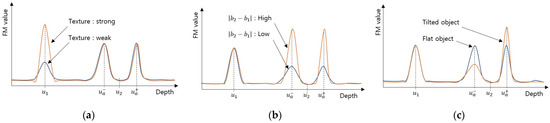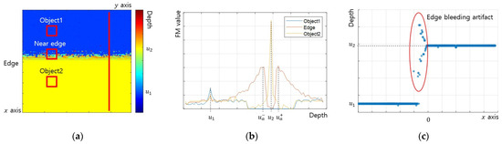 where is a function of the FM operator, which outputs the FM value when image is input. The depth was estimated as the distance at which the FM value has the maximum value for the , points of the image. Therefore, the conditions under which edge bleeding artifacts occur are as follows.