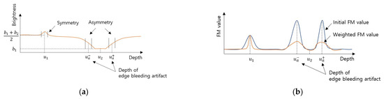 Third, the difference in brightness between the two objects is proportional to the maximum value of the gradient , as expressed in Equation (7). Therefore, the FM value at the near edge area increases as the difference in brightness increases, as shown in Figure 5b, resulting in more edge bleeding artifacts.