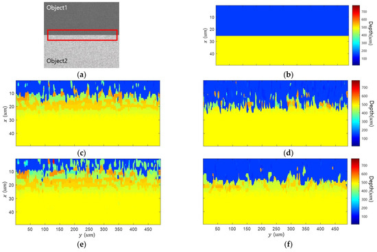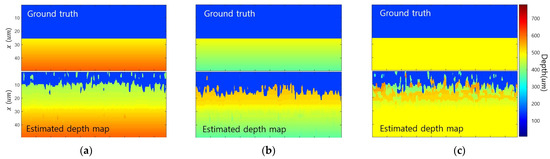 The evaluation measurements for comparing the performance of simulation results include the root mean square error (RMSE) and the width of the edge bleeding artifact. The RMSE measures the error between the ground truth and the estimated depth map. The RMSE measurement was performed around the edge as a region of interest to increase the impact of the edge bleeding artifact. When the size of the region of interest is , the ground truth is , and the estimated depth map is , the RMSE is as follows.