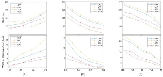 Figure 8 compares the edge bleeding artifacts according to the DoF, texture, and brightness differences between objects. The DoF was adjusted by modifying the f-number, and the texture was adjusted by changing the contrast of object 1. The texture strength ratio is the ratio of the contrast of object 2 and that of object 1. Figure 8a compares the DoF. As the DoF becomes shorter, the blur widens, and the width of the bleeding artifact widens. The longer DoF reduces edge bleeding artifacts but reduces depth resolution and increases noise. Therefore, RMSE decreases as the DoF lengthens as the edge bleeding artifact decreases but does not decrease continuously due to noise. Figure 8b compares the edge bleeding artifacts according to texture. As the texture weakens, the edge bleeding artifact becomes stronger in all FM operators. Figure 8c shows the differences in brightness between the objects. The edge bleeding artifact becomes stronger in all FM operators as the brightness difference increases.