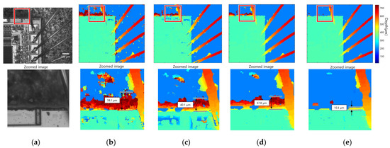 Figure 12 presents the result of 3D imaging of the bonding wire connecting the semiconductor and lead of the IC. The above line figures are the all-in-focus image and the result of applying each FM operator, and the bottom line figures are enlarged images of the red boxes. Figure 12a,b show a focus image and initial depth map performed by SFF using a gradient-based FM operator. The width of the edge bleeding artifact in the initial map is 58.1 µm. Figure 12c shows the results of the adaptive window size method, and the width of the artifact is measured to be 40.1 µm, which has a 30.9% reduction performance. Figure 12d shows the results of the guided filtering method, and the width of the artifact is measured to be 37.8 µm, resulting in a 34.9% reduction performance. Figure 12e shows the results of the proposed method, and the width of the artifact is measured to be 10.3 µm, resulting in a reduction performance of 82.2%. A closer look at the all-in-focus image showed that the semiconductor, bottom layer, and bonding wire have strong textures. On the other hand, the shaded area of the bottom layer had a weak texture. As a result of SFF, the depth of the wire bonded to the semiconductor was calculated. Nevertheless, noise occurred due to an incorrect depth estimation in some low-contrast areas. Furthermore, edge bleeding artifacts occurred in locations where the brightness difference between the objects was large, and the texture was weak. The positions marked with red squares were enlarged and shown below in the original results image. Many edge bleeding artifacts occurred between the semiconductor and the bottom layer. In addition, an edge bleeding artifact occurred between the wire and the bottom layer. The noise was reduced in the results of the adaptive window size method and guided filtering method, but edge bleeding artifacts remained. The edge bleeding artifact was greatly reduced after the proposed edge bleeding artifact reduction method.