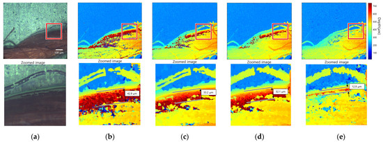 Figure 13 presents the result of 3D imaging of nylon thread. The above line figures are the all-in-focus image and the result of applying each FM operator, and the bottom line figures are enlarged images of the red boxes. The width of the measured edge bleeding artifact is 42.9 µm for the initial method, 33. 2 µm for the adaptive window method, 32.1 µm for the guided filtering method, and 12.9 µm for the proposed method. The reduction percentage of the compared methods is about 22%, while the reduction percentage of the proposed method is 70%. In the focus image, Figure 13a, the bottom layer has a strong texture, but some areas of the nylon thread have a weak texture. Furthermore, there was a large difference in brightness between the nylon thread and the bottom layer. In this case, edge bleeding artifacts occurred in the direction of the nylon thread with a weak texture. Figure 13b shows that considerable noise occurred in the weak-texture area because SFF was performed using the gradient-based FM operator. Figure 13c,d show that some noise was removed in compared methods, but edge bleeding artifacts remained. Figure 13e shows that the edge bleeding artifact was reduced noticeably after applying the edge bleeding artifact reduction method.