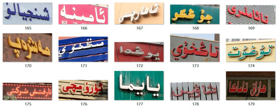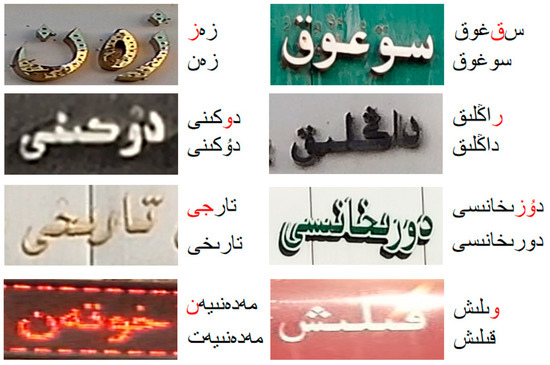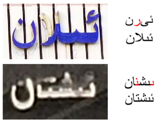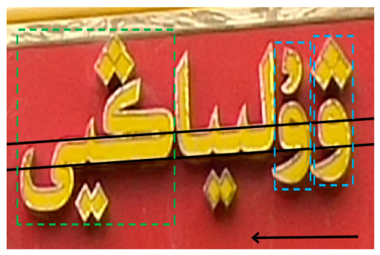 On the other hand, in addition to the common challenges faced by computer vision tasks such as background complexity and blur occlusion, scene Uyghur has its own unique challenges. In terms of morphological structure, Uyghur is a typical adhesive language [9], where characters are glued together to form concatenated segments, a feature that is particularly common in scenes. There is no uniform regulation for the width and height of characters, which are relatively random; the shape and structure vary greatly [10], which hinders the application of general character recognition algorithms. In terms of writing rules, Uyghur is written around a baseline from right to left, and many letters on the baseline have the same main body part, which can only be distinguished by subtle differences in the number and position of upper and lower punctuation marks or symbols outside the baseline. One more point and symbol or one less point and symbol will affect the shape of the character, resulting in the inability to spell or the changing of the meaning of the word [9], causing recognition errors. Figure 1 shows an example of the Uyghur features of the scene.