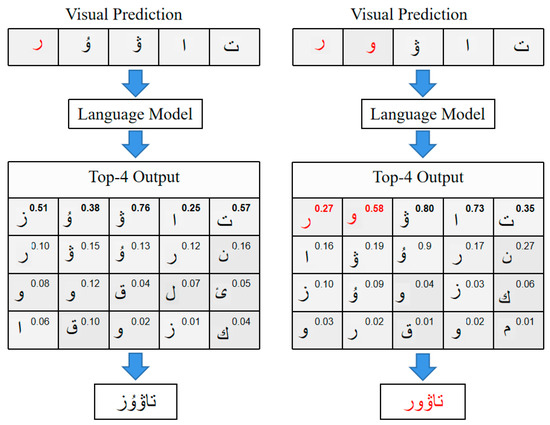 ” is obtained (left side of Figure 2). However, as the number of wrong characters in the input visual prediction increases, the correction of the language model becomes challenging and may lead to wrong corrections (the input word on the right side of Figure 2 is “