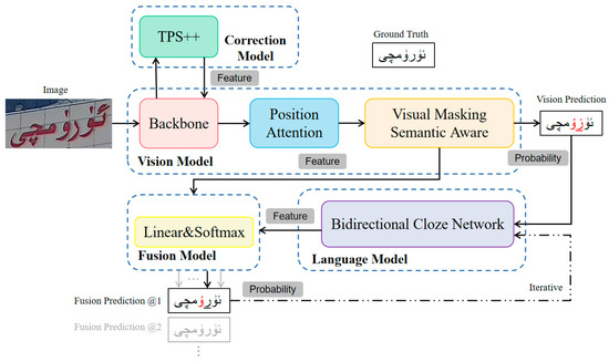 As shown in Figure 3, the proposed model is based on Transformer’s encoder–decoder framework and consists of four parts: Correction Model (CM), Vision Model (VM), Language Model (LM) and Fusion Model (FM). First, TPS++ is used to perform feature-level correction on the text in the input image, and the correction result is fed back to the two-dimensional visual features. Then, the visual features are horizontally aggregated through the improved small U-Net. In the training phase, through the Visual Masking Semantic Awareness (VMSA) module, the visual features of the selected characters are occluded to obtain a masked feature map, and the occluded characters are reasoned to obtain visual probability predictions. During the test phase, the VMSA module is removed, and the visual probability prediction is performed. Then, the visual prediction is inputted into LM for language rule learning to obtain semantic features. FM combines visual features and semantic features into fusion features for fusion probability prediction. Finally, the prediction results are input into LM for repeated iterations to correct the prediction results.