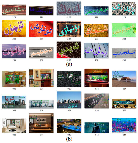 The process of constructing the synthetic scene Uyghur image dataset is as follows: First, 1 million initial entries are selected from the Uyghur website. These entries undergo effective word filtering, and 500,000 entries are chosen as the foundational corpus. Then, background images are collected. This paper uses the natural scene images provided by SynthText to build the background image library. Finally, image synthesis is performed. Following the SynthText method, during the synthesis process, the maximum width-to-height ratio of text regions is set to 20, the minimum width-to-height ratio is set to 0.3, and the minimum text region area is set to 100. Each image contains no less than one Uyghur text region, resulting in the generation of 50,000 synthetic images, as shown in Figure 7a. In the synthesis process using TextRecognitionDataGenerator, the maximum word length is set to 30, the minimum length is set to 3, and random Gaussian noise, optical distortions, and other enhancements are added to enrich the training samples; this process generates 150,000 synthetic images, as shown in Figure 7b.