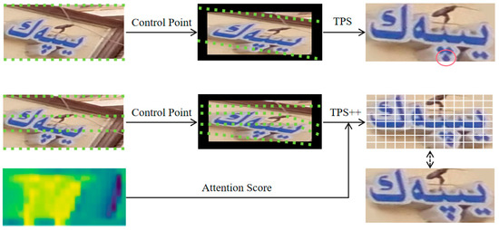 Aiming at the problem of scene Uyghur oblique deformation, the correction results of TPS [35] are not satisfactory because the calculation of TPS parameters is contentless, resulting in the corrected image only focusing on the geometric structure of the text, causing character deformation and the out-of-bounds phenomenon. This paper adopts TPS++ [34] with added attention mechanisms to suppress deformation and out-of-bounds by using text content to constrain the movement of control points.