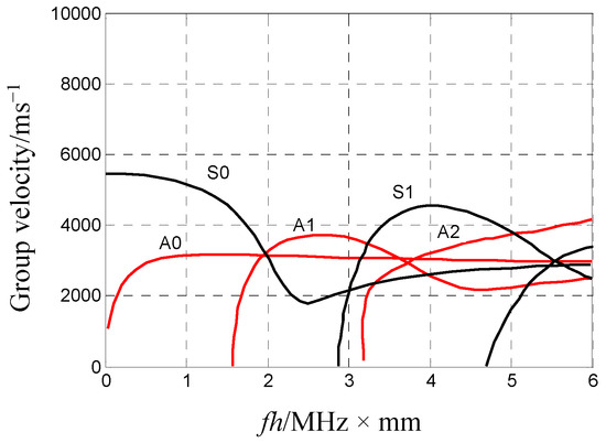 Lamb waves are stress waves propagating in a structure with two free parallel planes, and their wave characteristics are expressed by the Rayleigh–Lamb equation, which determines whether the Lamb wave mode is multi-mode or dispersion. There are at least two Lamb wave modes, with their propagation speeds related to the frequency at any activation frequency. A Lamb wave is divided into a symmetric (S) wave and an anti-symmetric (A) wave based on the phase relationship of the mass points on the surface of an object. Compared with isotropic material plates, composite material plates present complex wave characteristics that depend on the corresponding fibre material, fibre laying direction, and resin material. However, the main characteristics of Lamb waves are basically consistent. The relationship between the group velocity and frequency–thickness product (, in ) of Lamb waves in an aluminium plate structure [21] is shown in Figure 1 to clarify their characteristics in the plate; the multi-mode and dispersion characteristics for these Lamb waves carry rich information with a high application value for plate structure health monitoring. A well-characterised Lamb wave can be selected for plate structure health monitoring; this is conducive to determining its mode and wave speed and better serves a given application.