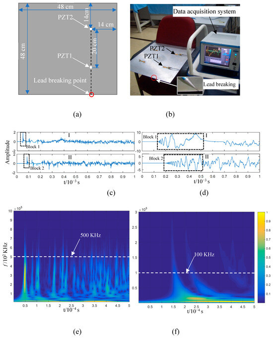 Lead-breaking test conducted on an aluminium plate structure: (a) experimental layout and (b) setting; (c,d) signals collected from the piezoelectric ceramic sensors PZT1 and PZT2 at the end face (c) and upper surface (d); (e,f) wavelet time–frequency analysis of the first 5000 points of the PZT1 signal, with lead breaking at the end face (e) and upper surface (f).