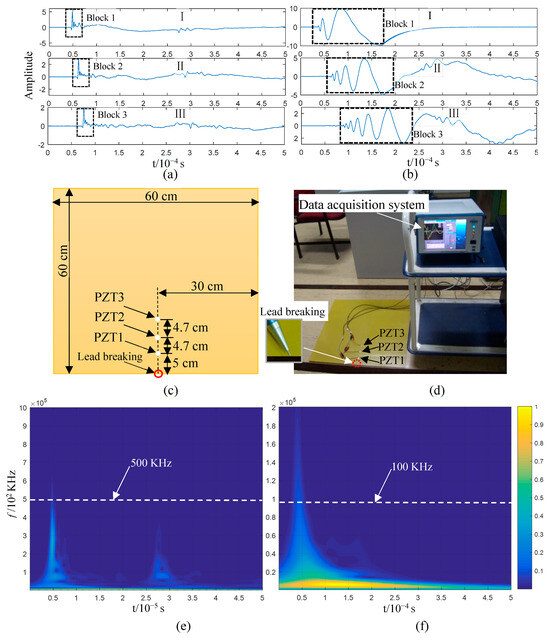Lead-breaking test conducted on epoxy fibreglass plate structure: (a) experimental layout and (b) setting; (c,d) signal collected from the piezoelectric ceramic sensors PZT1, PZT2, and PZT3 at the end face (c) and on the upper surface (d); (e,f) wavelet time–frequency analysis of the first 5000 points of the PZT1 signal with lead breaking at the end face (e) and upper surface (f).