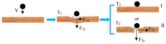 According to the above analysis, the obtained AE signal is the superposition of the OP- and IP-generated AEs if the plate damage is caused by the impact of external objects. The amplitude of the IP-generated AE (damage) is far less than that of the OP-generated one, considering that external matter can only damage a plate structure with high kinetic energy. Moreover, there is essentially no difference between the two acoustic sources. Diagnosing whether damage is caused directly by the waveform variation of the impact—as well as determining, without sufficient analysis, that an impact AE is the cause, even if it is judged from a certain characteristic quantity of the impact AE—is difficult. This AE generated by damage might be recognised if the impact AE is interpreted based on various factors, such as the characteristics of the mode’s wave velocity, the mode’s frequency band, the relationship between force direction and mode, and the damage process induced by the impact in the mode cut-off range. When an external object impacts the plate structure, its kinetic energy is absorbed by the latter and converted into potential energy, leading to the deformation of the plate structure. This energy conversion process is realised by a force, more specifically, an external force, as shown in Figure 6. The generated internal force will cause fracturing if the deformation exceeds the bearing capacity of the plate structure, as shown in sub-graph II of Figure 6. There is a time difference between the appearance of the external and internal forces; undoubtedly, there is also a time difference for the corresponding AE signals. Note that the mode wave cannot be superimposed with the mode wave when the two modes are generated simultaneously since the wave velocity of the former is greater than that of the latter. That is, the OP-generated AE is dominated by the mode. Even if there is a low-energy -mode wave, this cannot be superimposed on the mode wave. As the IP occurs later than the OP, the IP-generated AE also arises later than the OP-generated AE; however, the mode velocity is greater than the one and far greater than the low-frequency component of the mode. In this case, the AE of the mode generated alongside damage might be superimposed with that generated by OP. The AE of the mode extracted from that of the mode generated by an impact can only be generated by damage. Since damage-induced AEs continue to occur in the impact process, which is beyond control, the corresponding -mode wave should also be extensively distributed in the OP-generated AE waveform.