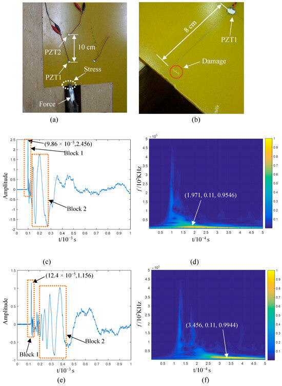 Acoustic emission (AE) signals generated via the local damage of the epoxy fibreglass plate and its wavelet time–frequency analysis: (a) local force of epoxy plate and piezoelectric ceramic layout; (b) damage area on the epoxy plate; (c) AE signal obtained by PZT1 and (d) corresponding wavelet time–frequency analysis of the first 5000 points; (e) AE signal obtained by PZT2 and (f) corresponding wavelet time–frequency analysis of the first 5000 points.