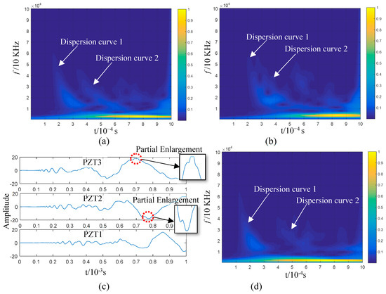 The resulting AE is shown in Figure 9a. No impact damage was observed on the plate structure through visual inspection, although the AE amplitude exceeded the voltage input range of the detection system (as shown in the insets of Figure 9a). The wavelet time–frequency analysis (Figure 9b,d) showed the dispersion characteristics of the wave in the signals collected by all the PZTs. However, the -mode waveform could not be identified in the time domain and time–frequency plots. The high-frequency components of the AE’s mode were abundant according to the above analysis. Those in Figure 9a could be extracted to suppress the interference of low-frequency waves. On this basis, the mode information of the impact AEs could be analysed. The lower frequency limit of high-pass zero-phase filtering was set as 100 kHz. The filtering results are shown in Figure 10a, with the sub-graphs I–III presenting the filtering results of the three sensor signals.
