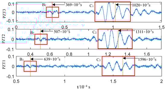 The reason why the OP-generated AE is dominated by the mode was discussed in the previous section, and we do not intend to ignore the mode generated simultaneously because its energy is small. In the test illustrated in Figure 9, the component force parallel to the plate surface cannot be zero since a small amount of the mode wave packet exists in the impact AE. These two modes occur simultaneously when the plate is impacted according to the previous analysis. Since the mode propagation speed is greater than that of the mode, the two mode waves start to separate when they are generated, and the mode wave packet is always ahead of the mode wave packet on the time axis. A trace of the mode wave packet can be found by carefully analysing the waveforms before C1, C2, and C3. The waveforms marked in Blocks B1–B3 and their enlarged views are displayed in Figure 10a, showing their similarity. If the midpoint of these waves (the point indicated by an arrow in the insets) is taken as a reference point, the corresponding propagation velocity of the wave packet is ~3400 m/s (Table 1). The speed of the mode in Figure 3b is 3250 m/s. That is, the actual value matches the theoretical ones if the influences of noise, waveform attenuation, and propagation path on velocity are considered. Therefore, it has been confirmed that the above three waveforms correspond to the mode according to the propagation velocity of the Bn (n = 1,2,3) wave packets. However, this is not enough proof to demonstrate that the B1–B3 wave packets resulted from the impact; it must be proven that the B1–B3 and C1–C3 wave packets originated from the impact. The -mode wave packets generated simultaneously were calculated according to the reference point time of the -mode wave packets B1–B3 when the propagation distance and the velocity of the two modes were known. If the coordinates of these reference points fall within the C1–C3 wave packet period, the B1–B3 and C1–C3 wave packets will likely be generated from the impact. The actual propagation velocity between PZT3 and PZT1 (as shown in Table 1) can be obtained as the velocity of the and modes. The propagation distance is the distance from the impact position to the sensor (Figure 8). The time difference corresponding to the wave packet reference points of the impact-generated mode can be determined by calculating the TOA differences of the two mode wave packet reference points by referring to the point marked in the B1–B3 wave packets in Figure 10a. The results are summarised in Table 2. The time coordination of the -mode reference point in Table 2 was compared with the time domain of the corresponding wave packets C1–C3 (Figure 11). The reference time of the -mode wave packets B1–B3 and the corresponding time point of the calculated -mode wave packets are indicated in Figure 11; the time area of the -mode wave packets calculated using the -mode ones is highly coincident with the C1–C3 wave packets. Therefore, the -mode wave packets B1–B3 and the -mode wave packets C1–C3 in Figure 10a likely originated simultaneously from the impact. The - and -mode wave packets in the AEs generated by the impact of external objects, which were separated at the moment of generation due to their different propagation velocities, were verified via the analysis of the experimental results. The -mode wave packets will not be superimposed with the mode ones in the AE generated via the impact of external objects since their propagation velocity is greater than that of the -mode wave packets.