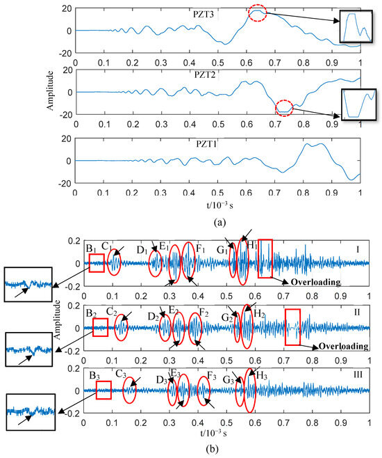When the impact tool was replaced by a pendulum mass for analysing the impact at the same position, damage could be observed on the epoxy fibreglass plate, as shown in Figure 8. The corresponding signals collected by the three PZTs are illustrated in Figure 12; these results are similar to those in Figure 9a in terms of the waveform. The AE generated by the impact of external matter was dominant, and the signal was overloaded with the waveform shown in dispersion. The difference is that the damage caused by the pendulum impact was visible. The high-frequency components of the three sensor signals (Figure 12a) were extracted using a zero-phase high-pass filter with a lower cut-off frequency of 100 kHz to further analyse the health information carried by the AEs generated by the pendulum impact; the results are shown in Figure 12b.